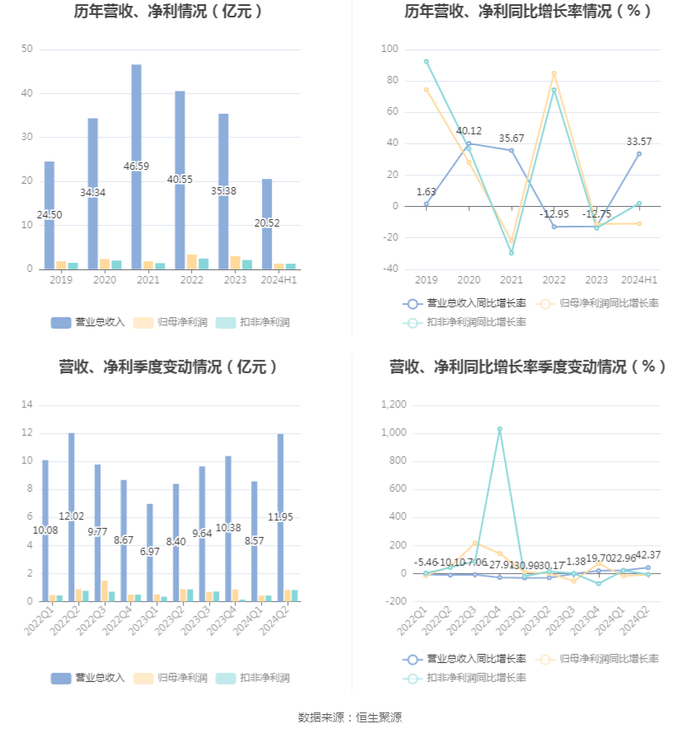 根据半年报,公司第二季度实现营业总收入11.95亿元,同比增长42.37%,环比增长39.55%;归母净利润8364.58万元,同比下降7.30%,环比增长95.93%;扣非净利润8288.41万元,同比下降5.81%,环比增长93.63%。