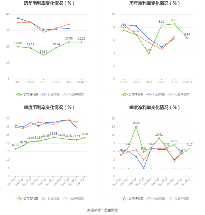 2024年上半年,公司毛利率为22.85%,同比下降0.27个百分点;净利率为6.34%,较上年同期下降3.01个百分点。从单季度指标来看,2024年第二季度公司毛利率为23.38%,同比下降0.30个百分点,环比上升1.27个百分点;净利率为7.17%,较上年同期下降3.74个百分点,较上一季度上升2.00个百分点。