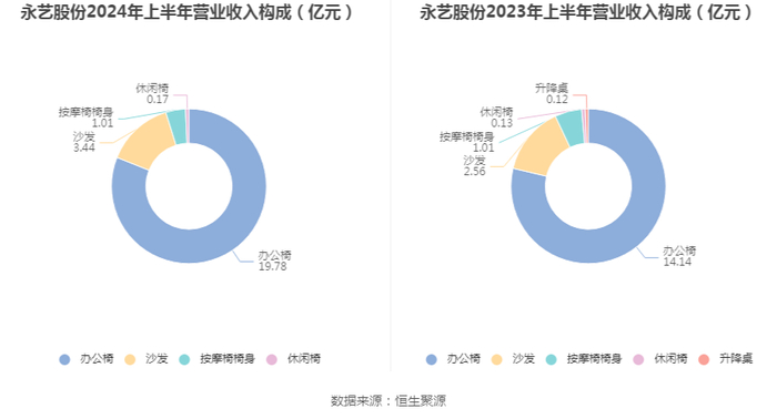 分产品来看,2024年上半年公司主营业务中,办公椅收入19.78亿元,同比增长39.88%,占营业收入的96.36%;沙发收入3.44亿元,同比增长34.15%,占营业收入的16.75%;按摩椅椅身收入1.01亿元,同比增长0.43%,占营业收入的4.93%。