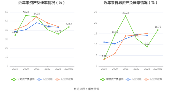 在偿债能力方面,公司2024年上半年末资产负债率为43.57%,相比上年末上升7.82个百分点;有息资产负债率为16.75%,相比上年末上升7.74个百分点。