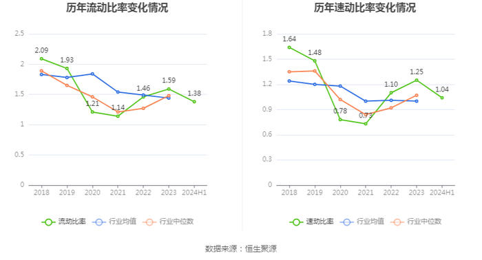 2024年上半年,公司流动比率为1.38,速动比率为1.04。