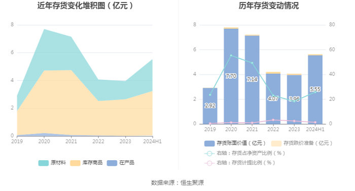 从存货变动来看,截至2024年上半年末,公司存货账面价值为5.55亿元,占净资产的25.85%,较上年末增加1.58亿元。其中,存货跌价准备为817.9万元,计提比例为1.45%。