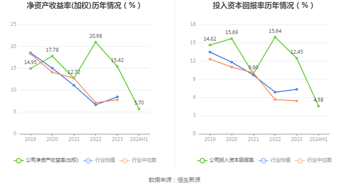 数据显示,2024年上半年公司加权平均净资产收益率为5.70%,较上年同期下降2.08个百分点;公司2024年上半年投入资本回报率为4.58%,较上年同期下降1.15个百分点。