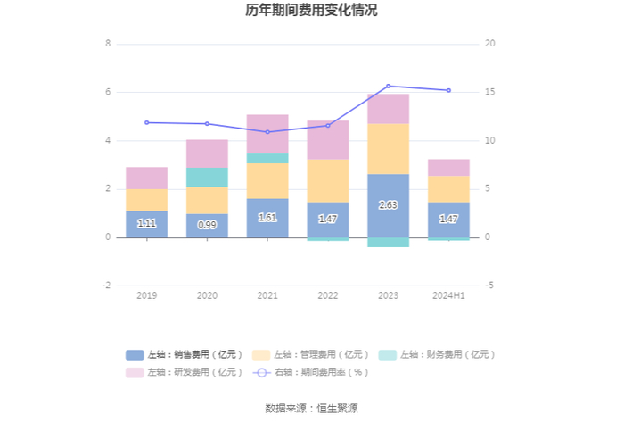 2024年上半年,公司期间费用为3.12亿元,较上年同期增加1.12亿元;期间费用率为15.22%,较上年同期上升2.20个百分点。其中,销售费用同比增长47.69%,管理费用同比增长29.44%,研发费用同比增长16.5%,财务费用由去年同期的-4233.80万元变为-1193.63万元。