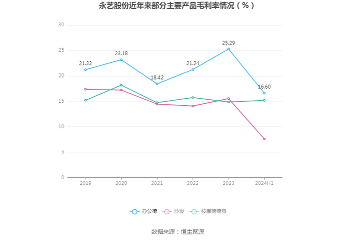 分产品看,办公椅、沙发、按摩椅椅身2024年上半年毛利率分别为16.60%、7.59%、15.19%。