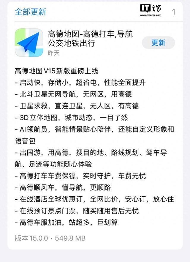 8月26日,高德地图iOS版本进行了更新,推出了15.0.0版本。该版本的改进和新增功能包括启动速度快、占用空间小、省电性能全面提升等。