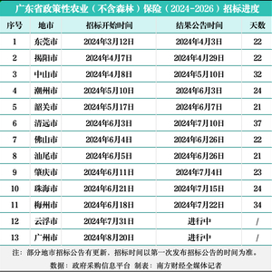 据南方财经全媒体记者从多家财险公司处获悉,今年广东各地市的招投标节奏各异,但多家财险机构积极参与投标,并关注接下来其他地市的招投标公布情况。