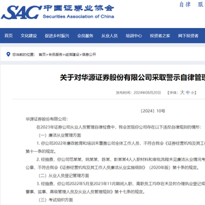 近日,因违反中国证券业协会(简称“中证协”)相关自律规则,华源证券被采取警示自律管理措施。这是中证协近10年来,首次开出针对机构而非个人的自律罚单。