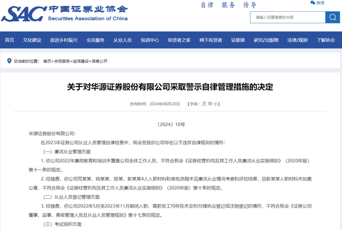 综合上述违规情节严重程度,中证协决定对华源证券合并采取警示的自律管理措施,并将本次自律管理措施记入中证协执业声誉信息库。
