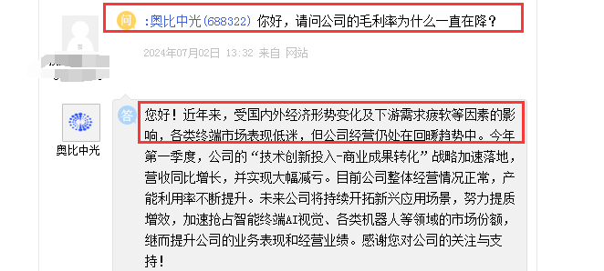 另外,需要注意的是,目前,奥比中光收入规模相对较小、营收近五年整体下滑超39%的同时,其毛利率同期亦从59.37%下滑至42.65%,引发投资者关注。业内指出,毛利是所有企业赚钱的基础,如果毛利降低了,销售和研发再怎么降本增效,最后利润也更难做出来。对于毛利率影响因素,奥比中光在2023年度报告中提及,毛利率水平主要受产品销售价格变动、原材料采购价格变动、市场竞争程度、产品更新换代因素的影响。