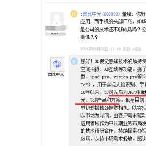 另外,笔者在上证e互动平台上发现,有关公司的产品应用场景,奥比中光还提及手机、游戏制作及影视剧拍摄等泛娱乐场景、运动健身等场景。