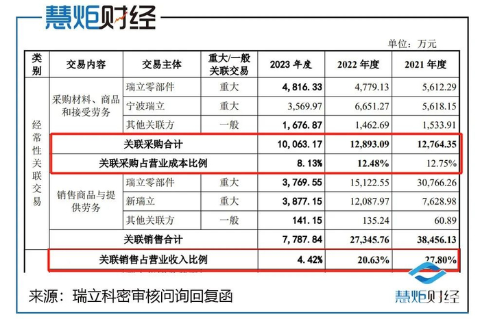 慧炬财经统计发现,在重组后的2022年,瑞立科密关联销售占比为20.63%,关联采购占比为12.48%,二者合计高达33.11%,而到了2023年关联销售与采购占比合计则降至12.55%。
