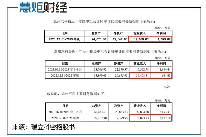招股书显示,2022年,温州汽科净资产2.07亿元,营收3.94亿元,净利润681.63万元,而2021年收购时估值对价则高达5.28亿元;值得注意的是,在收购前的2020年,温州汽科营收高达1.89亿元,净利润更是达到了3187.10万元。