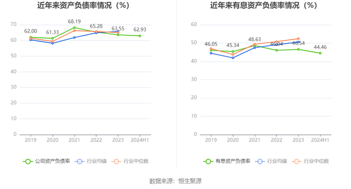 在偿债能力方面,公司2024年上半年末资产负债率为62.93%,相比上年末下降0.62个百分点;有息资产负债率为44.46%,相比上年末下降2.08个百分点。