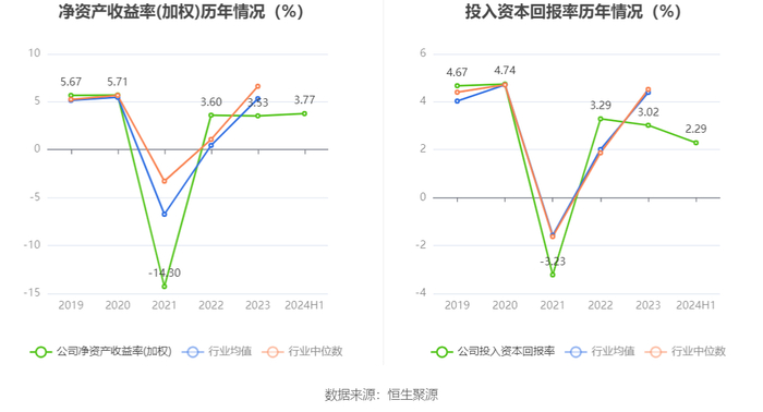 数据显示,2024年上半年公司加权平均净资产收益率为3.77%,较上年同期增长2.37个百分点;公司2024年上半年投入资本回报率为2.29%,较上年同期增长0.99个百分点。
