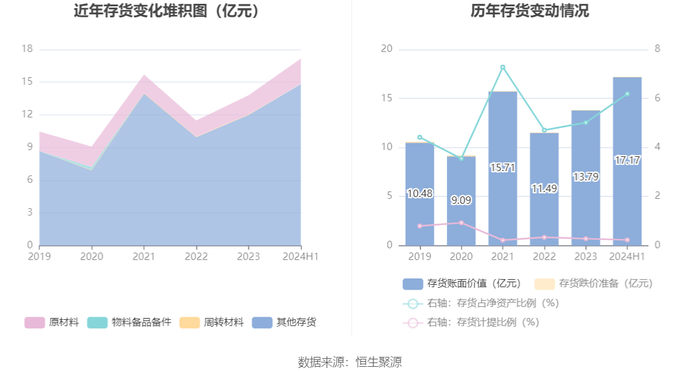 从存货变动来看,截至2024年上半年末,公司存货账面价值为17.17亿元,占净资产的6.19%,较上年末增加3.37亿元。其中,存货跌价准备为387.86万元,计提比例为0.23%。