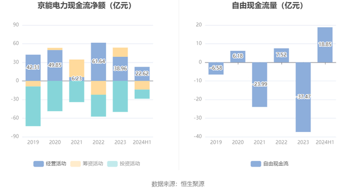 2024年上半年,公司经营活动现金流净额为22.62亿元,同比增加23.09亿元;筹资活动现金流净额-13.97亿元,同比减少23.70亿元;投资活动现金流净额-14.76亿元,上年同期为-18.93亿元。