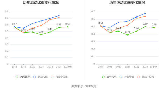 2024年上半年,公司流动比率为0.57,速动比率为0.49。