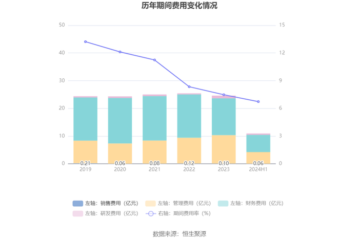 2024年上半年,公司期间费用为10.97亿元,较上年同期增加2052.49万元;但期间费用率为6.74%,较上年同期下降0.43个百分点。其中,销售费用同比增长66.83%,管理费用同比增长5.38%,研发费用同比增长333.85%,财务费用同比下降6.02%。