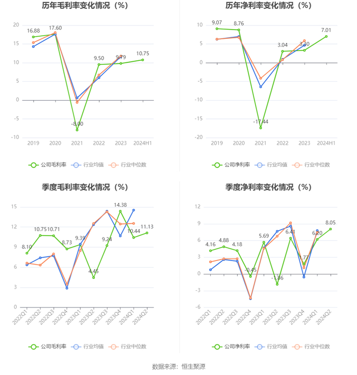 2024年上半年,公司毛利率为10.75%,同比上升3.47个百分点;净利率为7.01%,较上年同期上升4.55个百分点。从单季度指标来看,2024年第二季度公司毛利率为11.13%,同比上升6.68个百分点,环比上升0.69个百分点;净利率为8.05%,较上年同期上升9.91个百分点,较上一季度上升1.85个百分点。