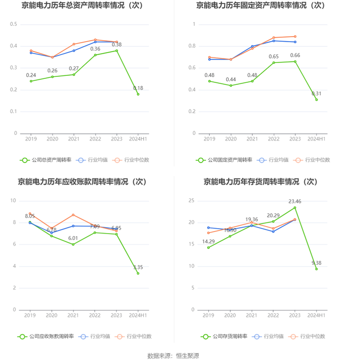 营运能力方面,2024年上半年,公司公司总资产周转率为0.18次,上年同期为0.18次(2023年上半年行业平均值为0.21次,公司位居同行业21/28);固定资产周转率为0.31次,上年同期为0.31次(2023年上半年行业平均值为0.41次,公司位居同行业21/28);公司应收账款周转率、存货周转率分别为3.35次、9.38次。