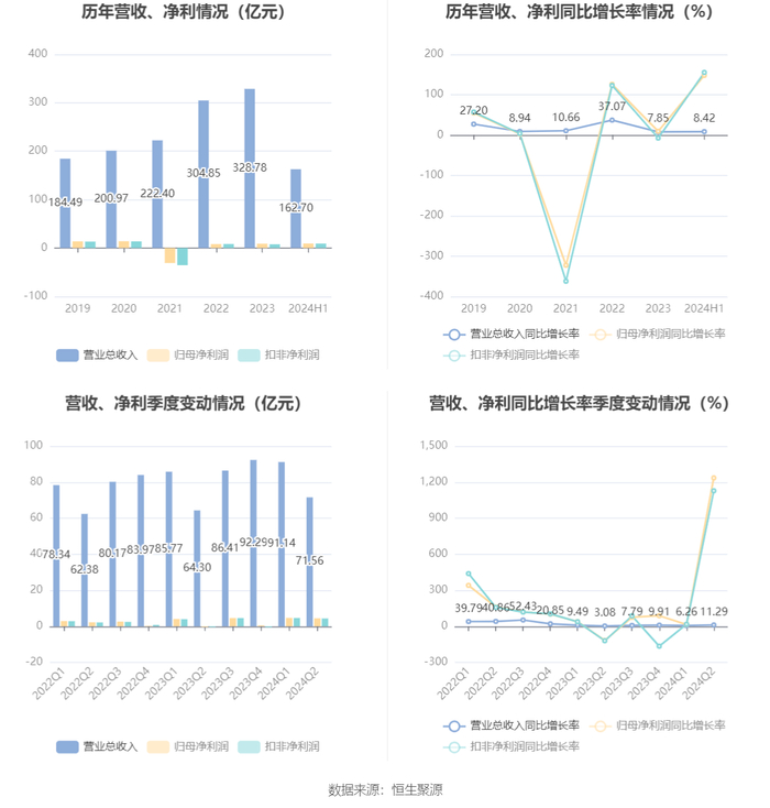 根据半年报,公司第二季度实现营业总收入71.56亿元,同比增长11.29%,环比下降21.49%;归母净利润4.45亿元,同比增长1234.82%,环比下降5.12%;扣非净利润4.36亿元,同比增长1127.91%,环比下降6.06%。