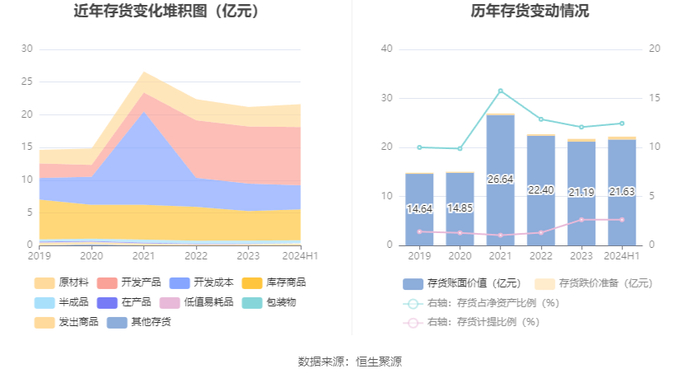 从存货变动来看,截至2024年上半年末,公司存货账面价值为21.63亿元,占净资产的12.46%,较上年末增加4424.41万元。其中,存货跌价准备为5862.94万元,计提比例为2.64%。