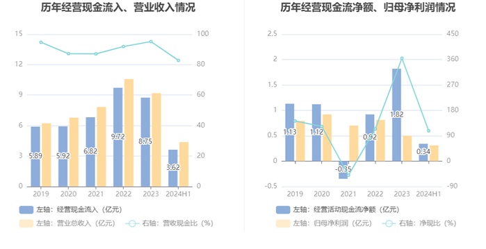 2024年上半年,公司营业收入现金比为82.80%,净现比为107.35%。