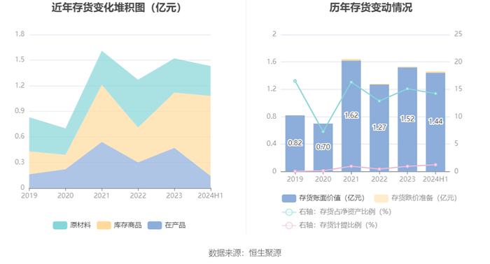 从存货变动来看,截至2024年上半年末,公司存货账面价值为1.44亿元,占净资产的14.24%,较上年末减少840.19万元。其中,存货跌价准备为180.14万元,计提比例为1.24%。