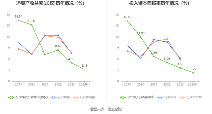 数据显示,2024年上半年公司加权平均净资产收益率为3.18%,较上年同期增长0.79个百分点;公司2024年上半年投入资本回报率为2.27%,较上年同期增长0.49个百分点。
