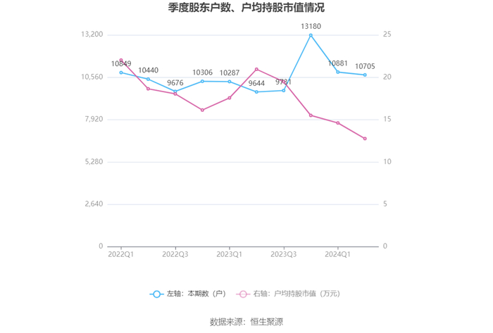 筹码集中度方面,截至2024年上半年末,公司股东总户数为1.07万户,较一季度末下降了176户,降幅1.62%;户均持股市值由一季度末的14.61万元下降至12.76万元,降幅为12.66%。