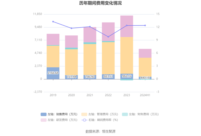 2024年上半年,公司期间费用为5426.67万元,较上年同期减少606.79万元;期间费用率为12.41%,较上年同期下降0.12个百分点。其中,销售费用同比下降2.44%,管理费用同比下降3.05%,研发费用同比下降19.79%,财务费用由去年同期的-9.37万元变为-96.36万元。