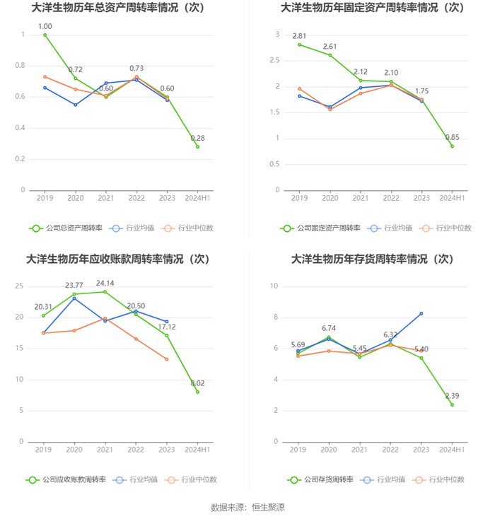 营运能力方面,2024年上半年,公司公司总资产周转率为0.28次,上年同期为0.31次(2023年上半年行业平均值为0.29次,公司位居同行业5/10);固定资产周转率为0.85次,上年同期为0.88次(2023年上半年行业平均值为0.88次,公司位居同行业7/10);公司应收账款周转率、存货周转率分别为8.02次、2.39次。