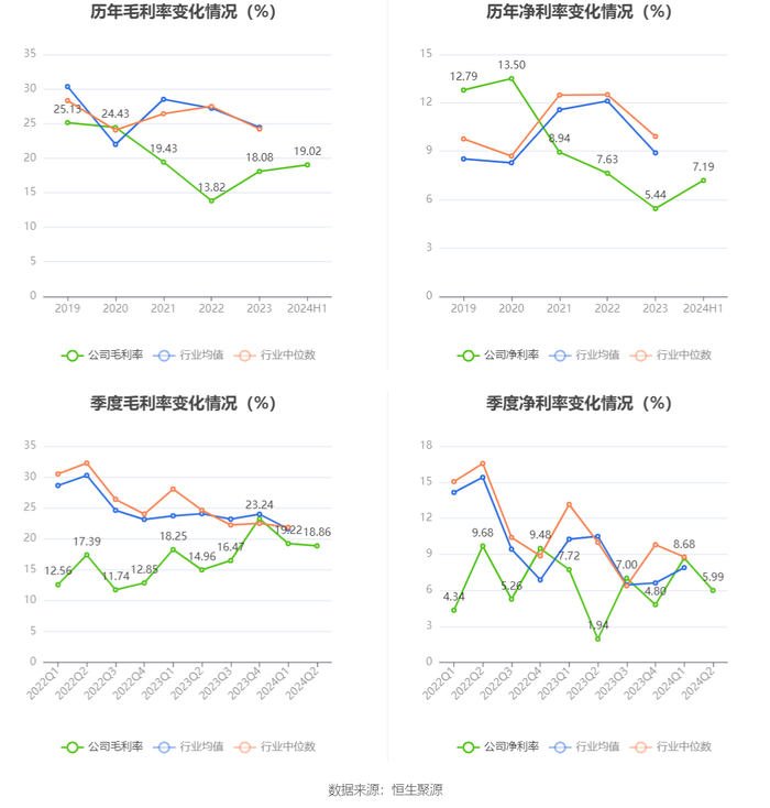 2024年上半年,公司毛利率为19.02%,同比上升2.35个百分点;净利率为7.19%,较上年同期上升2.24个百分点。从单季度指标来看,2024年第二季度公司毛利率为18.86%,同比上升3.90个百分点,环比下降0.36个百分点;净利率为5.99%,较上年同期上升4.05个百分点,较上一季度下降2.69个百分点。