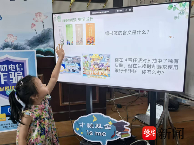 “绿书签的含义是什么呀?”“你在《蛋仔派对》抽中了稀有皮肤,但在兑换时却要求使用银行卡转账,你怎么办?”为了检验孩子们的知识储备,活动特别设置了有奖竞答环节。随着问题的抛出,孩子们积极参与,在欢声笑语中加深了他们对“扫黄打非”、绿色阅读、网络安全重要性的认识。活动最后,同学们在绿书签上写下自己对本次活动的感想和接下来学习生活的安排,并在横幅上签下自己的名字,表示要身体力行,做非遗“练习生”“扫黄打非”的践行者。