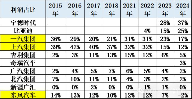 与此同时,老牌企业的利润出现了剧烈的下滑,一汽从2015年利润占比36%降到17%,上汽从2016年的42%降到12%,而吉利等表现相对平稳,从2021年的15%的峰值降低到5%,广汽也从2018年的7%的峰值降到2%,北汽则从2017年的11%降到2%,而东风从2015年的14%下降到了2%。