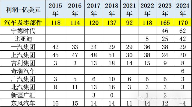 不过,中国汽车行业利润也出现了分化,在新能源领域的龙头企业比亚迪和宁德时代利润走高,而传统企业整体利润呈现下降趋势。