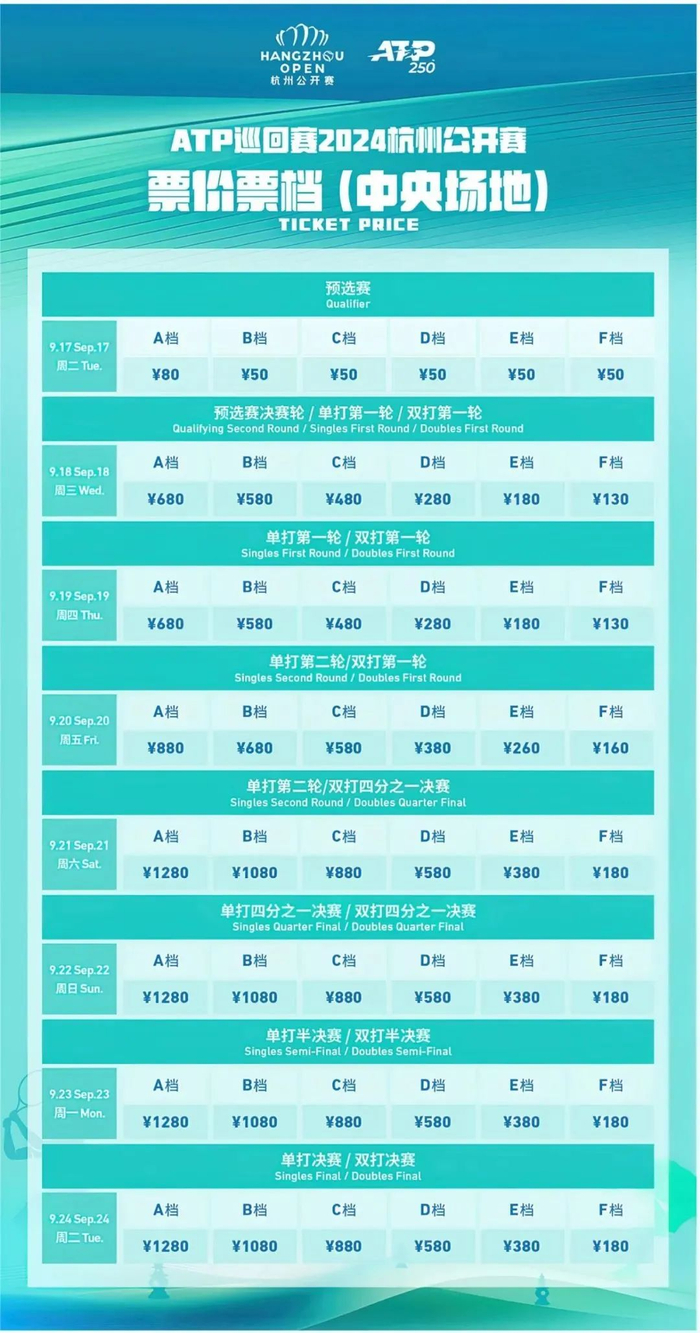 2024杭州公开赛的票价区间在50-1280元之间,此次所有票价均为全日通场票,即单张票可观看当天所有赛事。