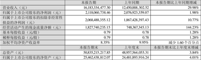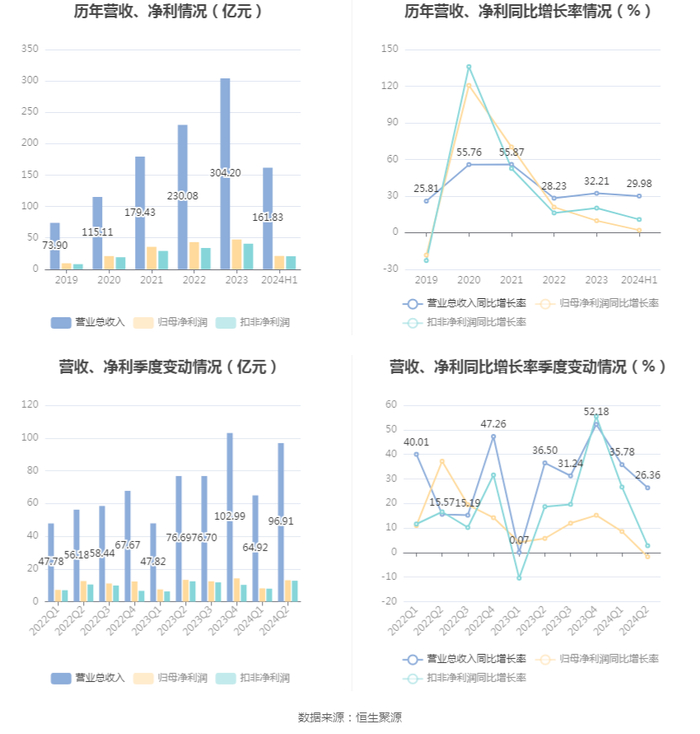 根据半年报,公司第二季度实现营业总收入96.91亿元,同比增长26.36%,环比增长49.27%;归母净利润13.07亿元,同比下降1.72%,环比增长61.12%;扣非净利润12.77亿元,同比增长2.77%,环比增长61.32%。