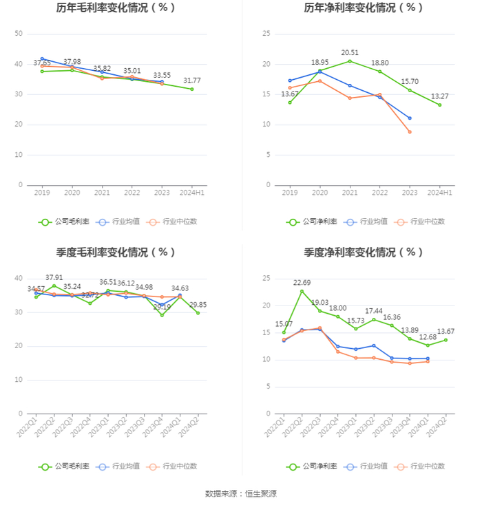 2024年上半年,公司毛利率为31.77%,同比下降4.50个百分点;净利率为13.27%,较上年同期下降3.52个百分点。从单季度指标来看,2024年第二季度公司毛利率为29.85%,同比下降6.27个百分点,环比下降4.78个百分点;净利率为13.67%,较上年同期下降3.77个百分点,较上一季度上升0.99个百分点。