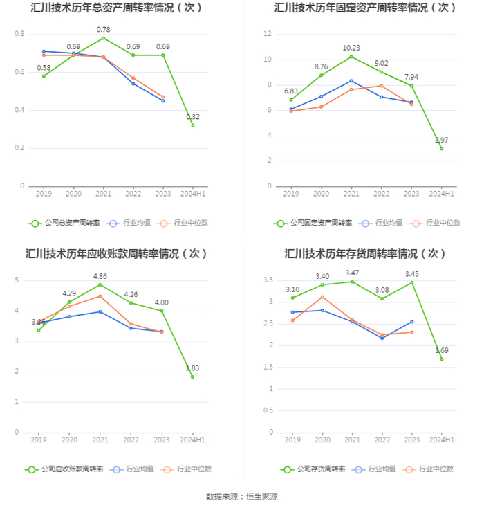 营运能力方面,2024年上半年,公司公司总资产周转率为0.32次,上年同期为0.31次(2023年上半年行业平均值为0.24次,公司位居同行业5/29);固定资产周转率为2.97次,上年同期为3.90次(2023年上半年行业平均值为3.53次,公司位居同行业12/29);公司应收账款周转率、存货周转率分别为1.83次、1.69次。