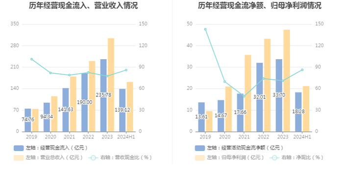2024年上半年,公司营业收入现金比为85.96%,净现比为86.29%。