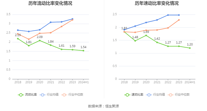 2024年上半年,公司流动比率为1.54,速动比率为1.20。