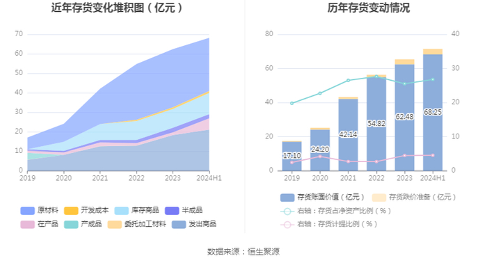 从存货变动来看,截至2024年上半年末,公司存货账面价值为68.25亿元,占净资产的26.8%,较上年末增加5.77亿元。其中,存货跌价准备为3.27亿元,计提比例为4.57%。