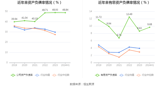 在偿债能力方面,公司2024年上半年末资产负债率为48.84%,相比上年末下降0.09个百分点;有息资产负债率为9.68%,相比上年末上升1.05个百分点。