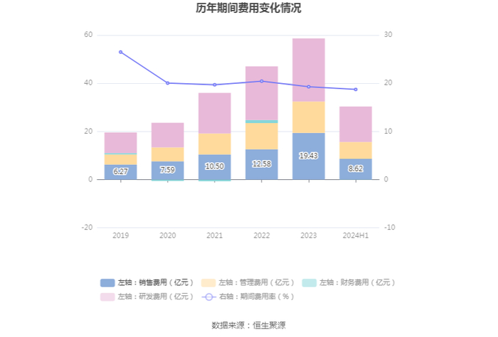 2024年上半年,公司期间费用为30.31亿元,较上年同期增加3.98亿元;但期间费用率为18.73%,较上年同期下降2.41个百分点。其中,销售费用同比增长14.71%,管理费用同比增长16.66%,研发费用同比增长13.71%,财务费用由去年同期的-1530.22万元变为-530.99万元。