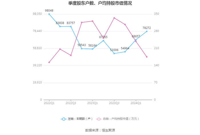 筹码集中度方面,截至2024年上半年末,公司股东总户数为7.83万户,较一季度末增长了9615户,增幅14.00%;户均持股市值由一季度末的238.71万元下降至175.53万元,降幅为26.47%。