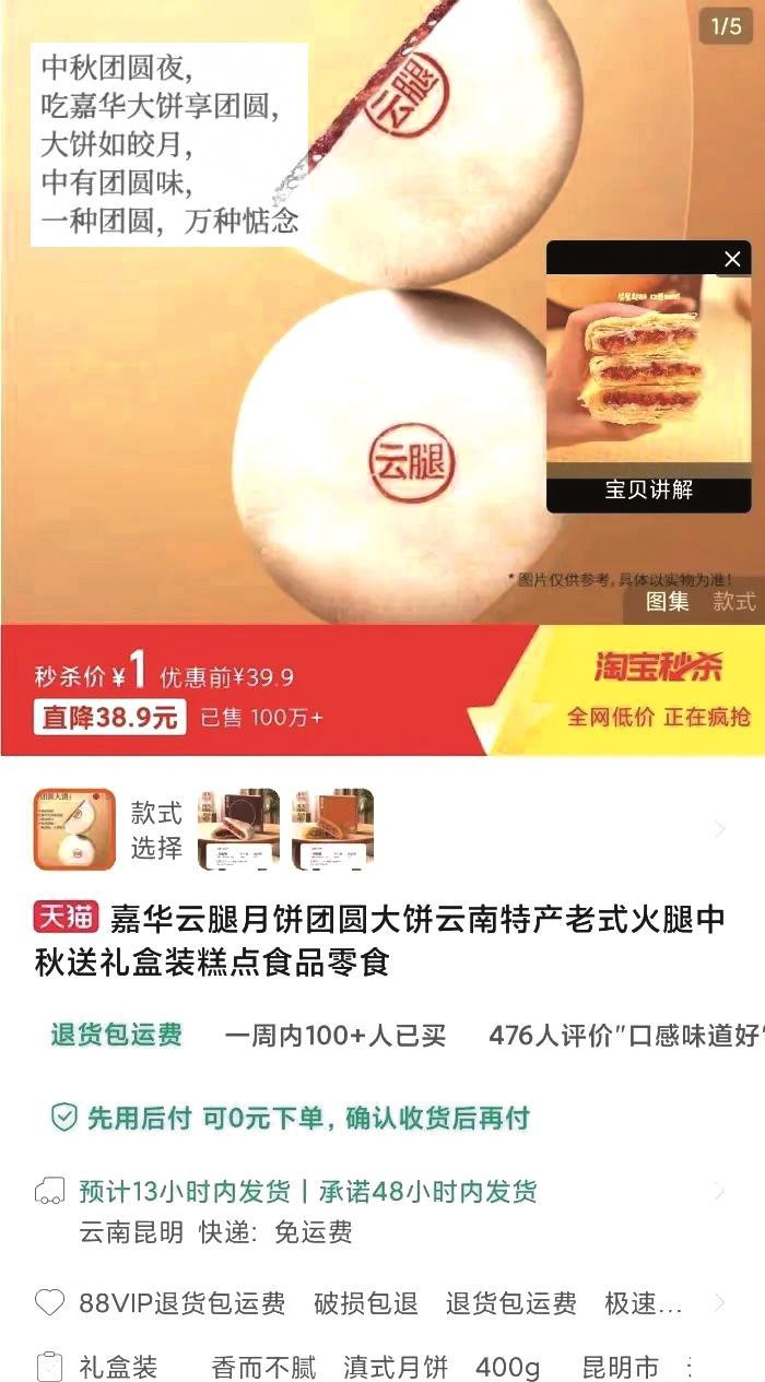 8月21日凌晨,嘉华食品淘宝旗舰店开售一元月饼。据多位消费者分享的购买页面截图显示,这款净含量400克/枚的云腿团圆大饼原售价为39.9元,秒杀价1元,承诺48小时内发货。