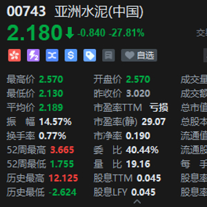 亚洲水泥(0743.HK)私有化计划告吹,股价应声大跌,一度跌近30%至2.13元,股价创5月21日以来新低。消息面上,集团公布,控股股东亚洲水泥股份提出以私有化决议案,最终未获法院会议上批准。因此私有化建议及计划已告失效。