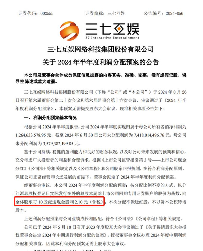 今年一季度,三七互娱宣布每 10 股分 2.1 元;